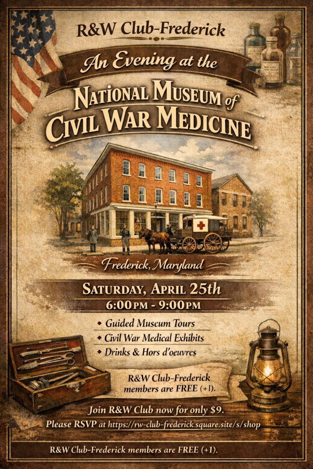 The Recreation and Welfare Club Frederick (R&WCF) is hosting an exclusive membership evening at the National Museum of Civil War Medicine in downtown Frederick, MD. The social and networking event will be held on Saturday, April 25, 2026, from 6 to 9 p.m., and light refreshments will be served.